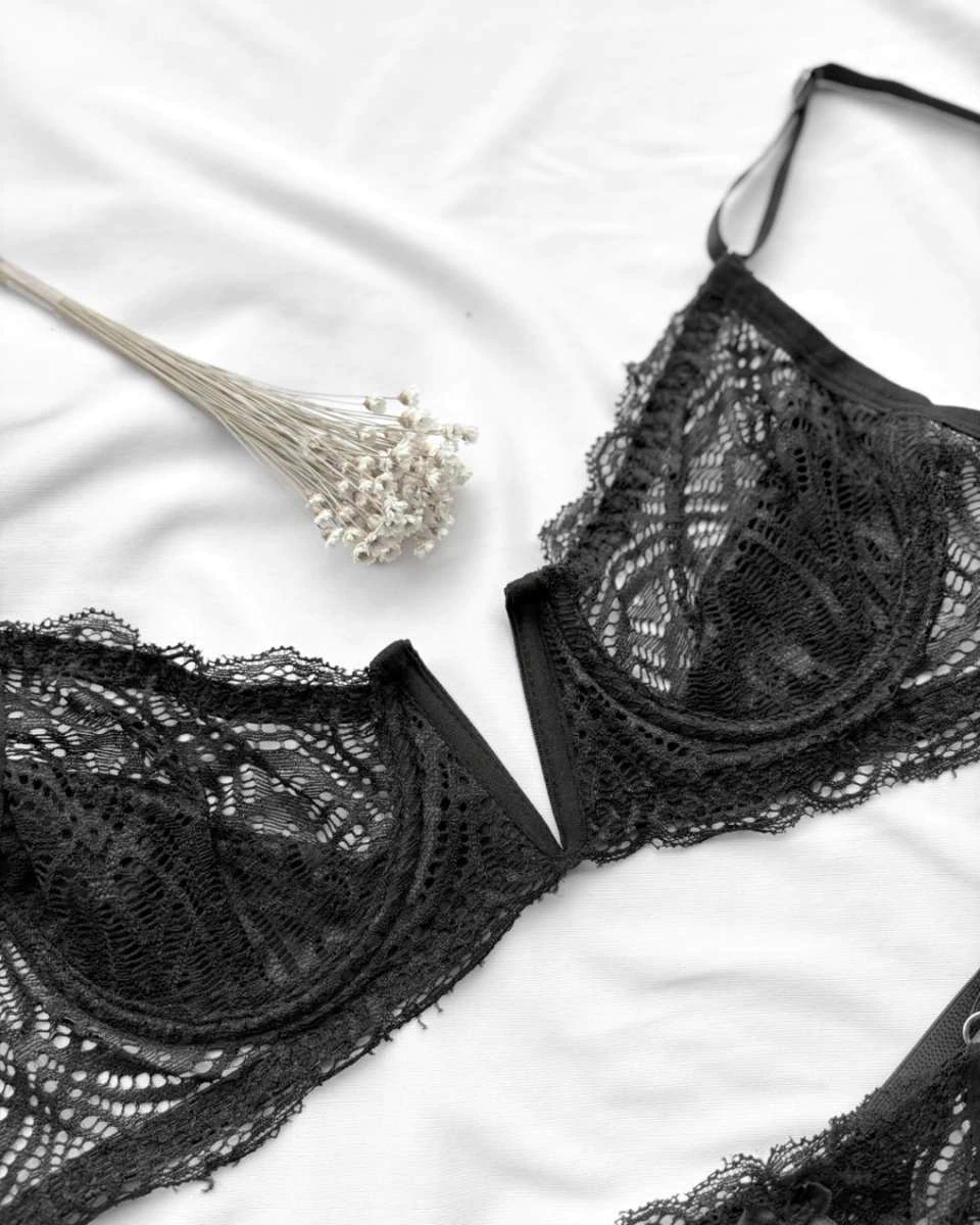 O Conjunto Lorena é puro charme com aquele toque de mistério que conquista. Feito todo em renda, o sutiã vem sem bojo, com forro meia-taça, aro de sustentação e um detalhe em “V” que valoriza o colo com sensualidade. As alças ajustáveis garantem conforto e encaixe perfeito no corpo.