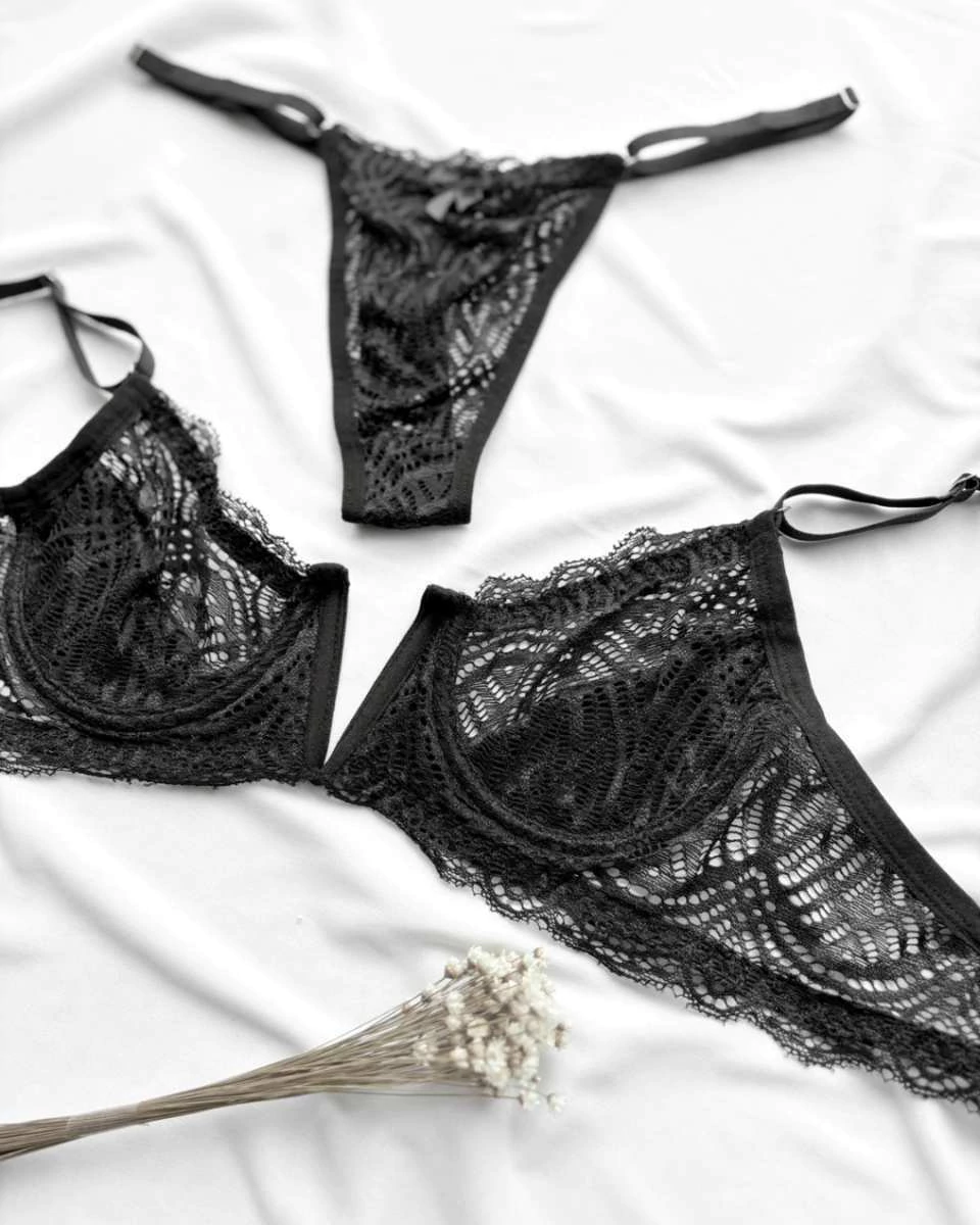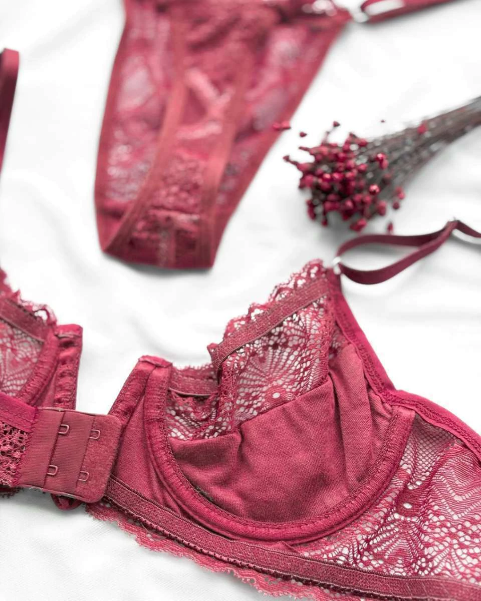 A calcinha fio dental, também toda em renda, possui lateral fina com regulagem e forro 100% algodão, proporcionando delicadeza e cuidado íntimo.