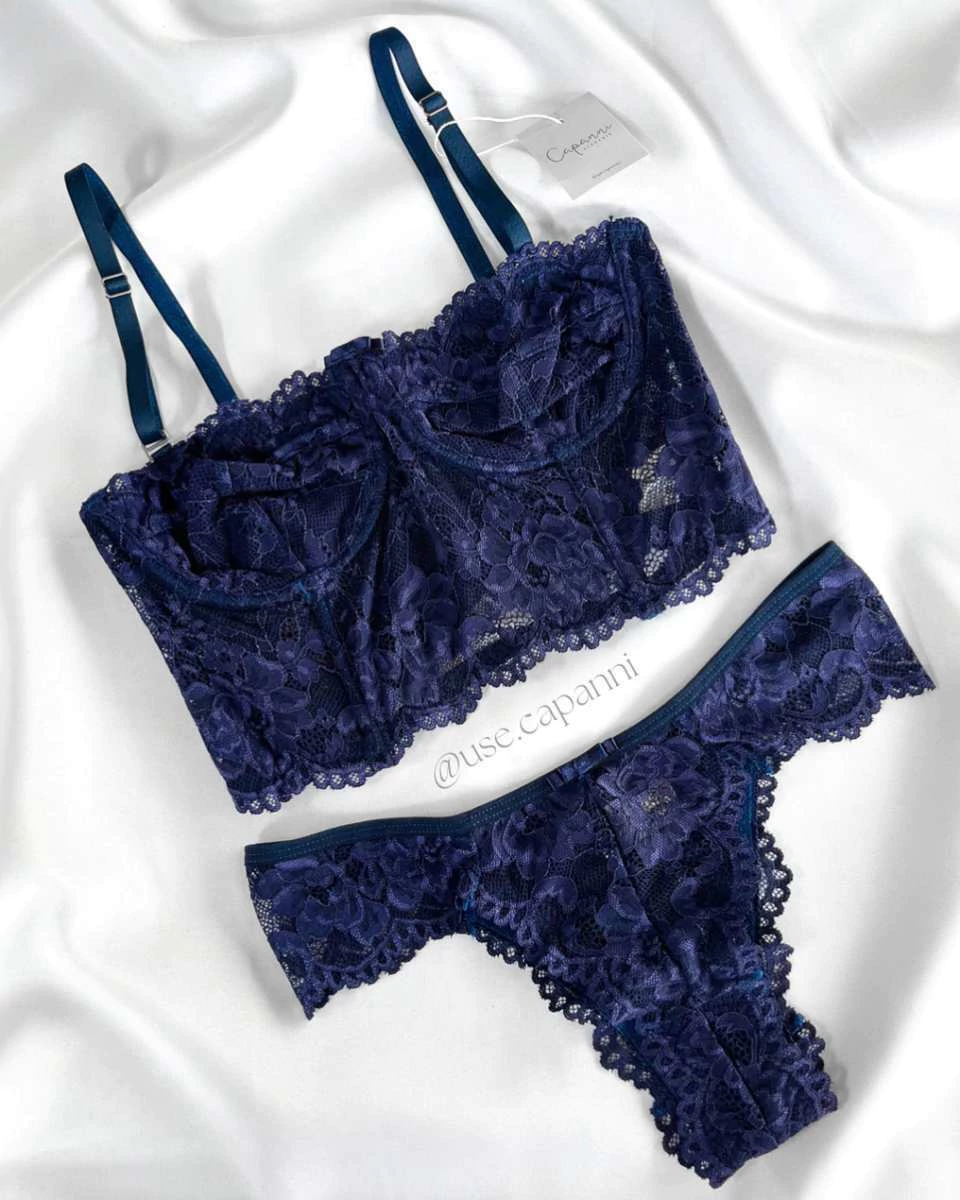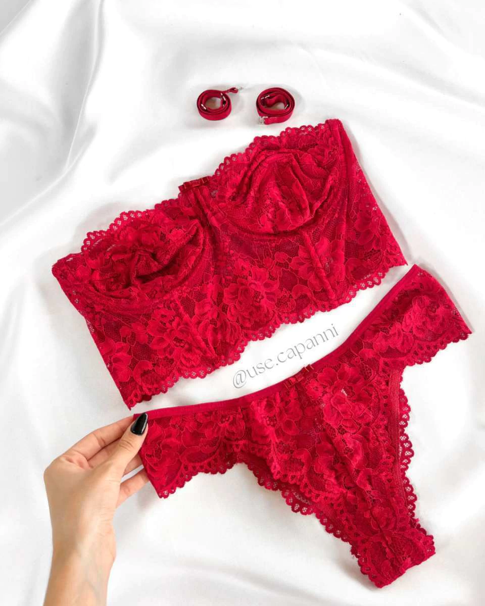 A calcinha acompanha no mesmo nível de sofisticação: toda em renda macia, com lateral mais grossinha pra maior conforto e forro 100% algodão aprovado por dermatologistas.